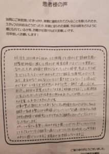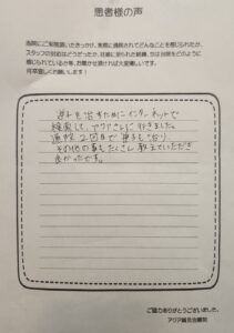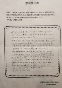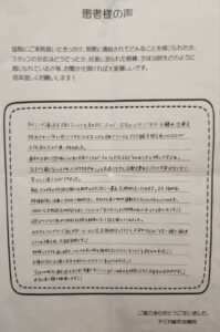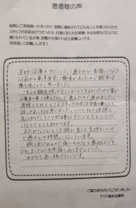 口コミが良かったので、来院したのですが,本当にスタッフの方々が皆さんいつも笑顔で丁寧に対応してくださいます。