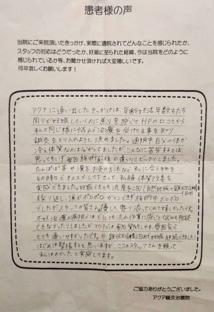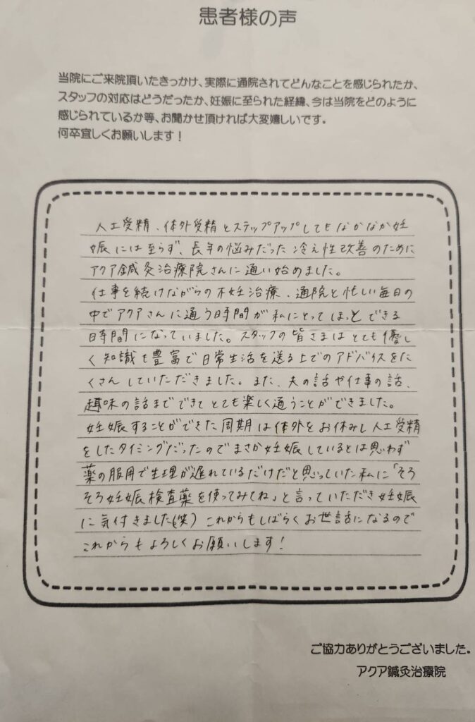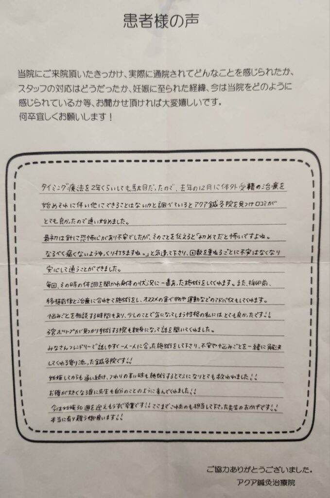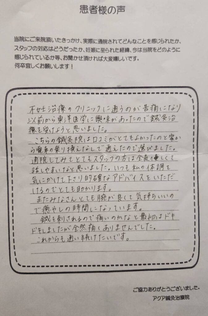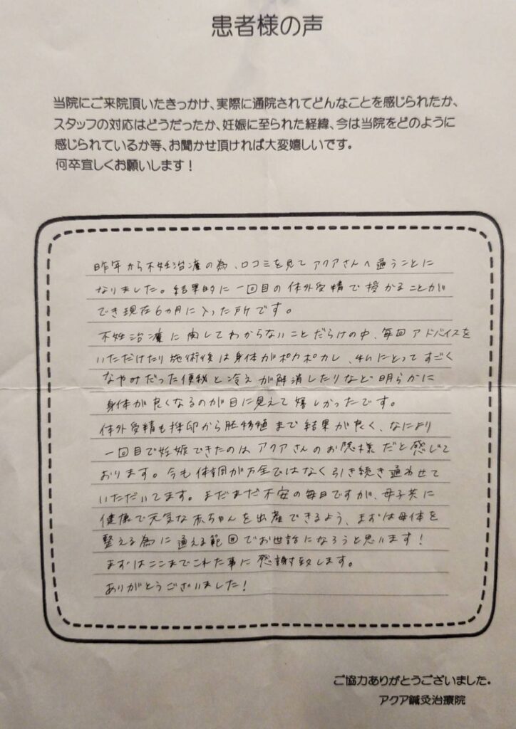 昨年から不妊治療の為、口コミを見てアクアさんへ通うことになりました。