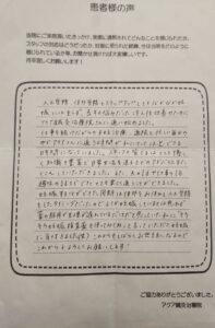 通院中、特に大きな体の変化は感じなかったものの、サボりがちな私が半年以上経った今も通院を続けているので、身体が楽になっているのだと思います。
