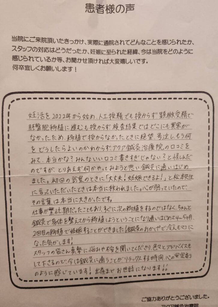 妊活を2022年から始め、人工受精でも授からず、顕微授精で胚盤胞移植に進むも授からず、検査結果ではどこにも異常がなかったため、移植で授からなかったときに絶望、号泣し、もう何をどうしたらよいのか分からず、アクア鍼灸治療院の口コミをみて、本当かな?みんな良い口コミ書きすぎじゃない?と怪しんだのですが、とりあえず何かやってみようと思い鍼灸に通いはじめました。