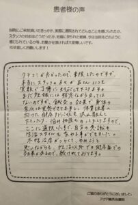 最初は鍼に恐怖心があり不安でしたが、そのことを伝えると「初めてだと怖いですよね。なるべく痛くないようゆっくり打ちますね。」と気遣って下さり、回数を重ねるごとに不安はなくなり安心して通うことができました。