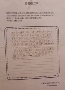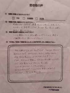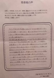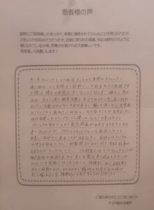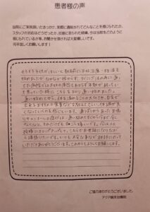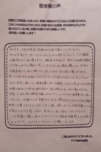 毎回治療の度に、不安や疑問に思っていることに対して、優しく分かりやすく答えて下さり、またホームケアのやり方、食事や睡眠のアドバイスも頂き、どれも忠実に実践したことも結果に繋がったのかもしれません。