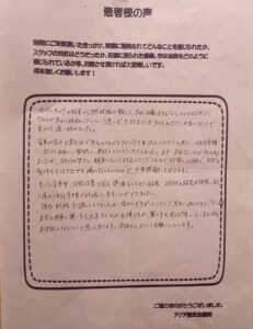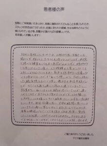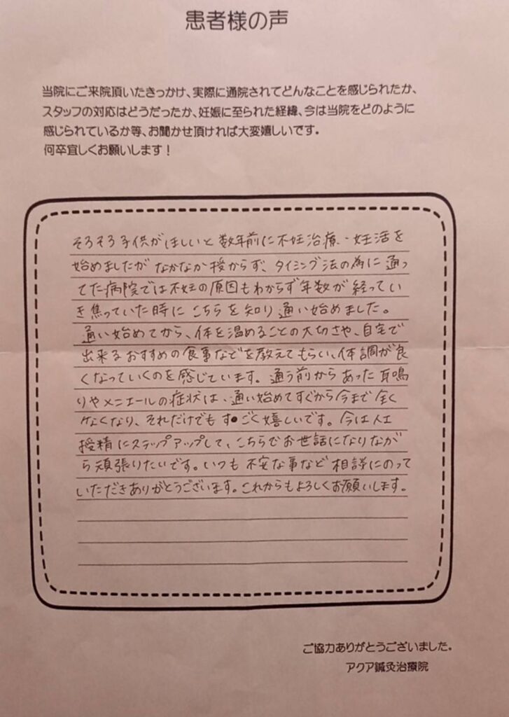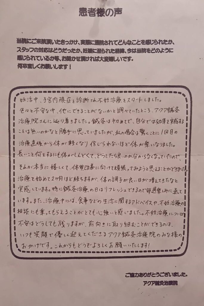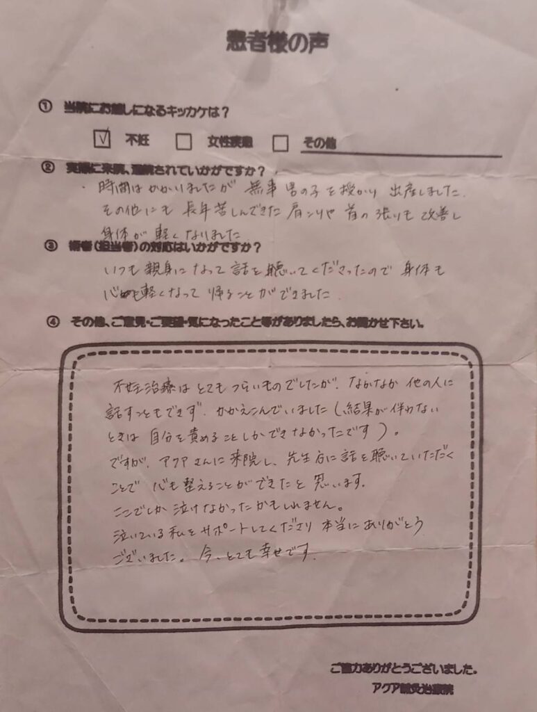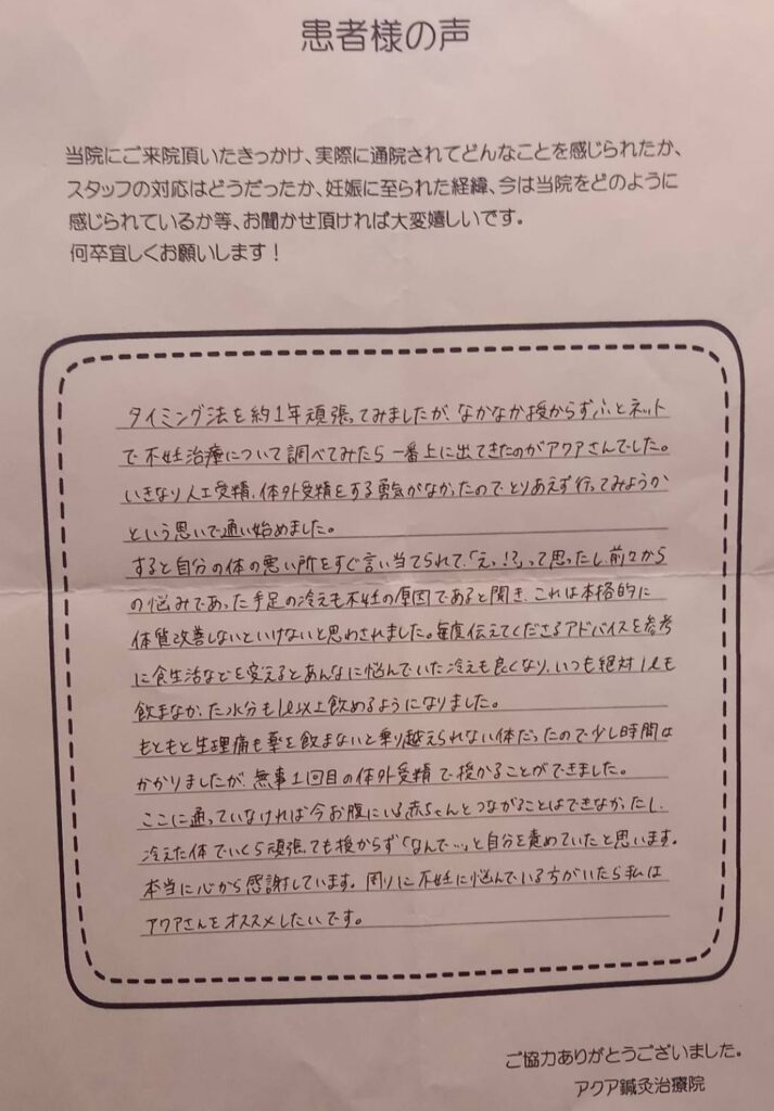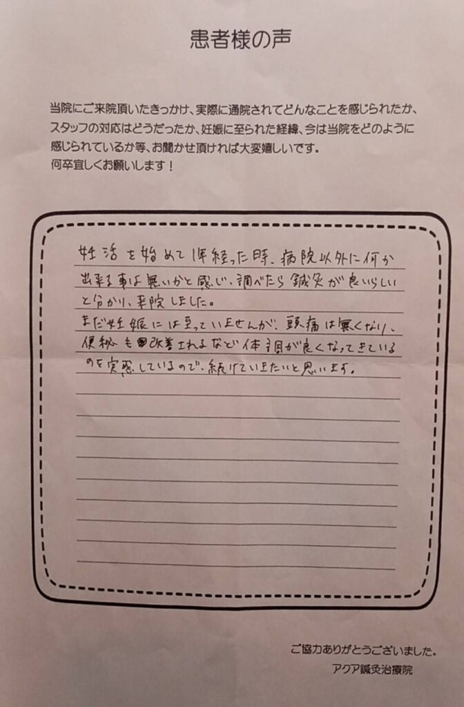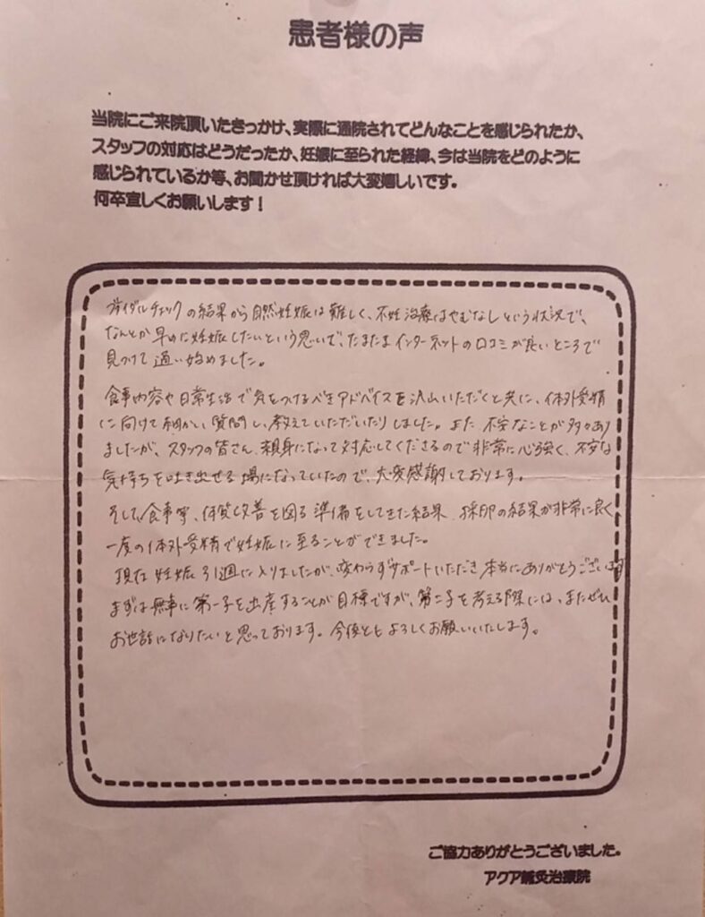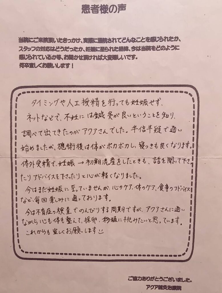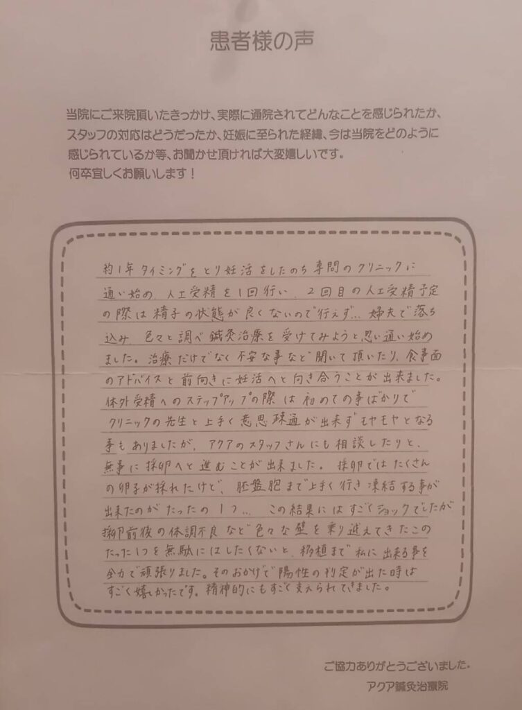 不妊治療についての不安はどうしても残りますが、前向きに取り組むことができるのは、いつも笑顔で優しく迎えてくださるアクア鍼灸治療院の皆様のおかげです。