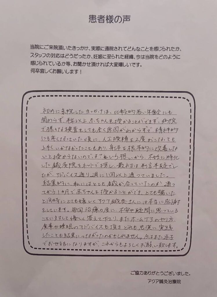 比較的若い年齢にも関わらず、1年以上赤ちゃんを授かることができず、病院で様々な検査をしても全く原因がわからずで、精神的にも辛くなっていた頃、人工受精を2度おこなっても上手くいかなかったこともあり、身体を根本的に改善しないと授からないのでは?という想いから、不妊に特化した鍼灸院をネットで探し、アクア鍼灸治療院さんに通わせていただいていました。
