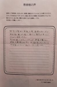 その他にも長年苦しんできた肩こりや首の張りも改善し身体が軽くなりました。