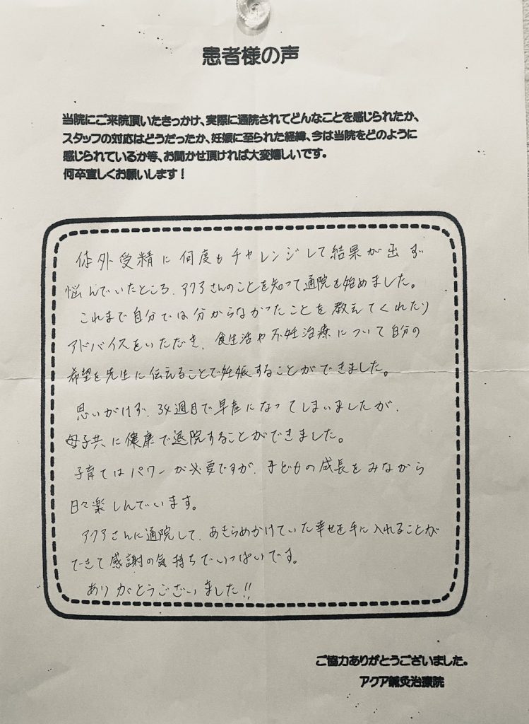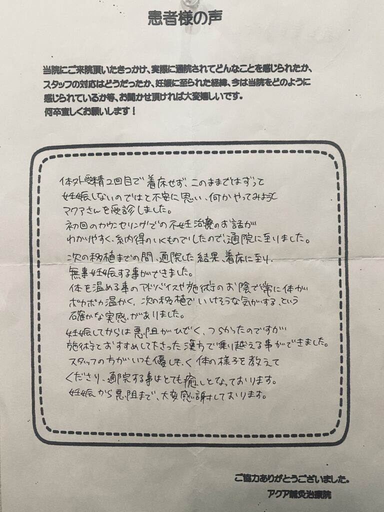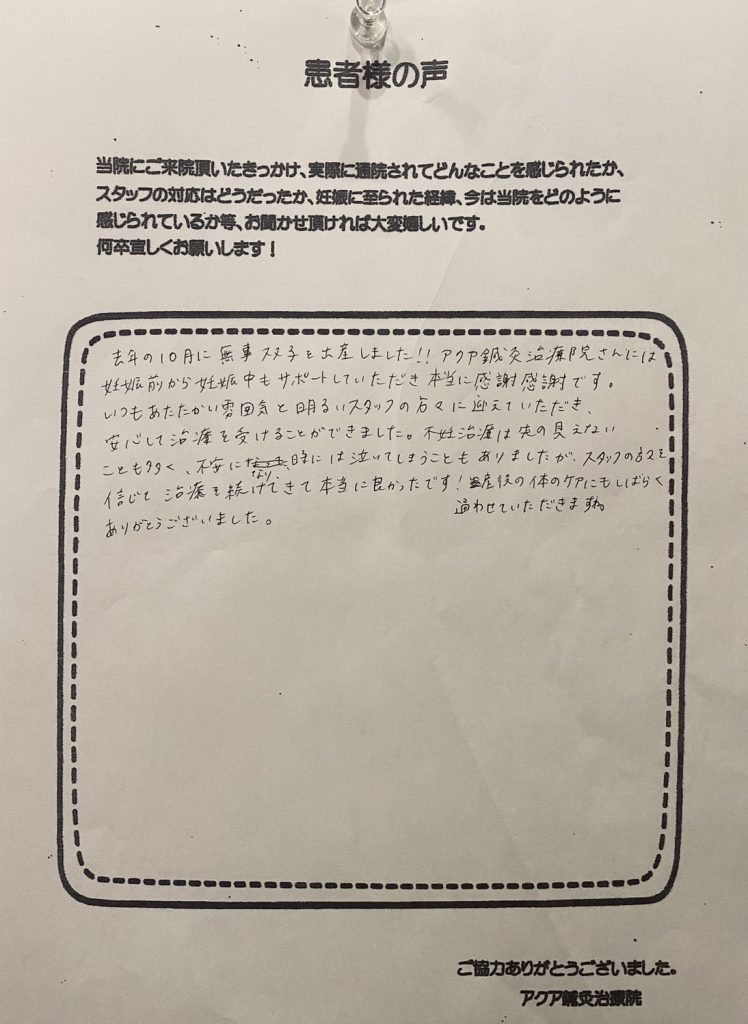 アクアさんに通院して、あきらめかけていた幸せを手に入れることができて感謝の気持ちでいっぱいです。