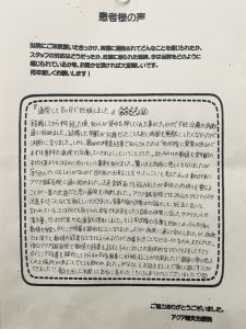 スタッフの方がいつも優しく、体の様子を教えてくださり、通院することはとても癒しとなっております。