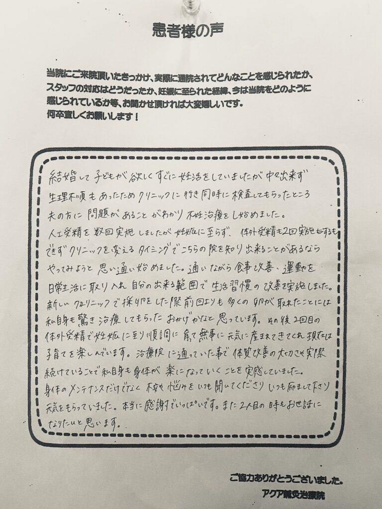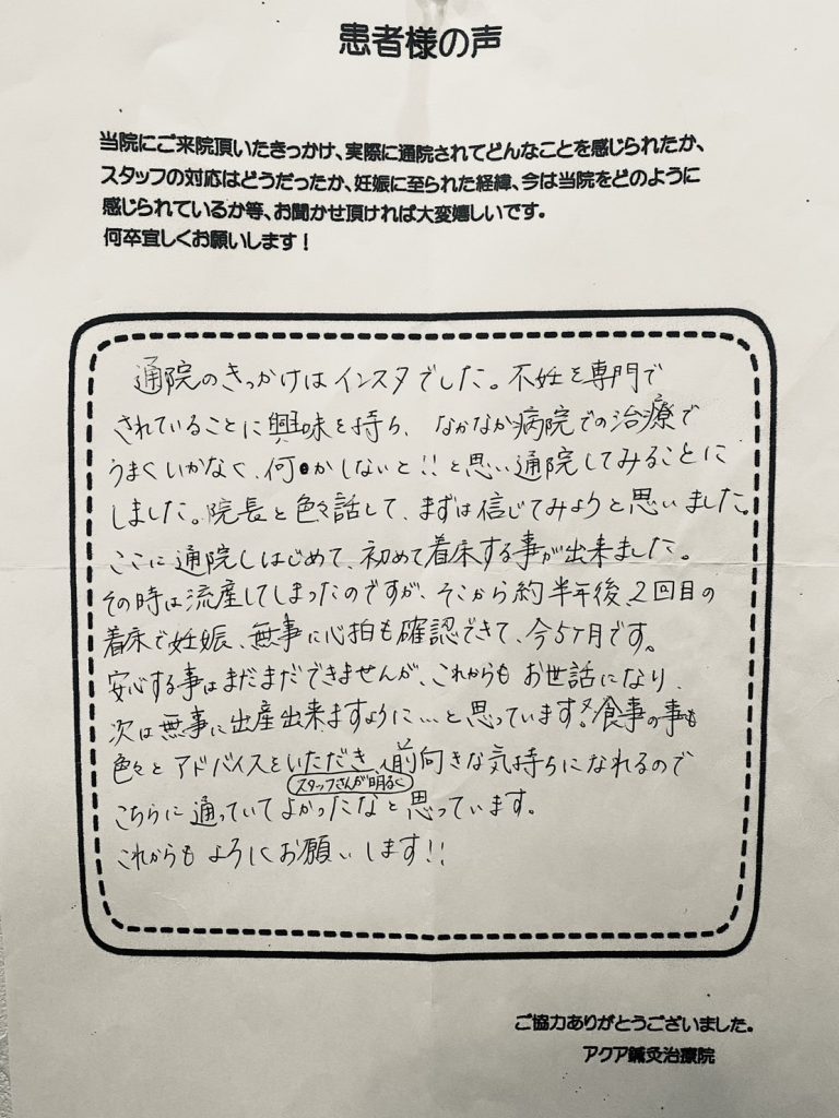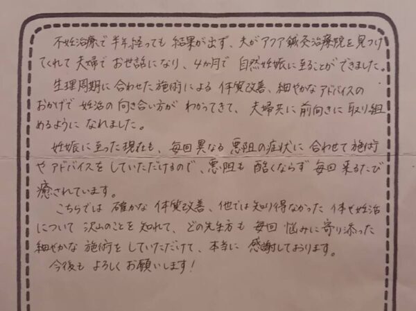 不妊治療で半年経っても結果がでず、夫がアクア鍼灸治療院を見つけてくれて夫婦でお世話になり、4ヶ月で自然妊娠に至ることが出来ました。