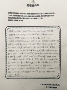 いつもあたたかい雰囲気と明るいスタッフの方々に迎えていただき、安心して治療を受けることができました。