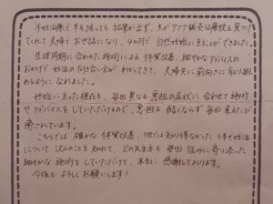 又、食事の事も色々とアドバイスをいただき、スタッフさんが明るく前向きな気持ちになれるのでこちらに通ってよかったなと思っています。